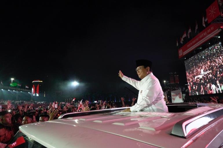Namun, malam itu bukan sekadar pesta. Prabowo memilih hadir lebih dekat dengan masyarakat. Dari atas kendaraan taktis Maung, mobil buatan dalam negeri, ia berdiri tegak di atap terbuka. Tangan Presiden terus melambai, menyapa lautan warga yang memadati area Monas.